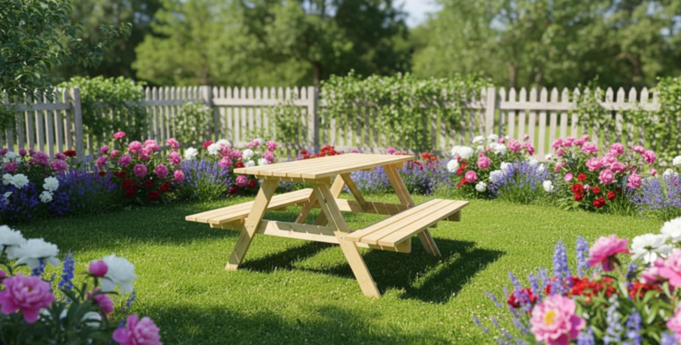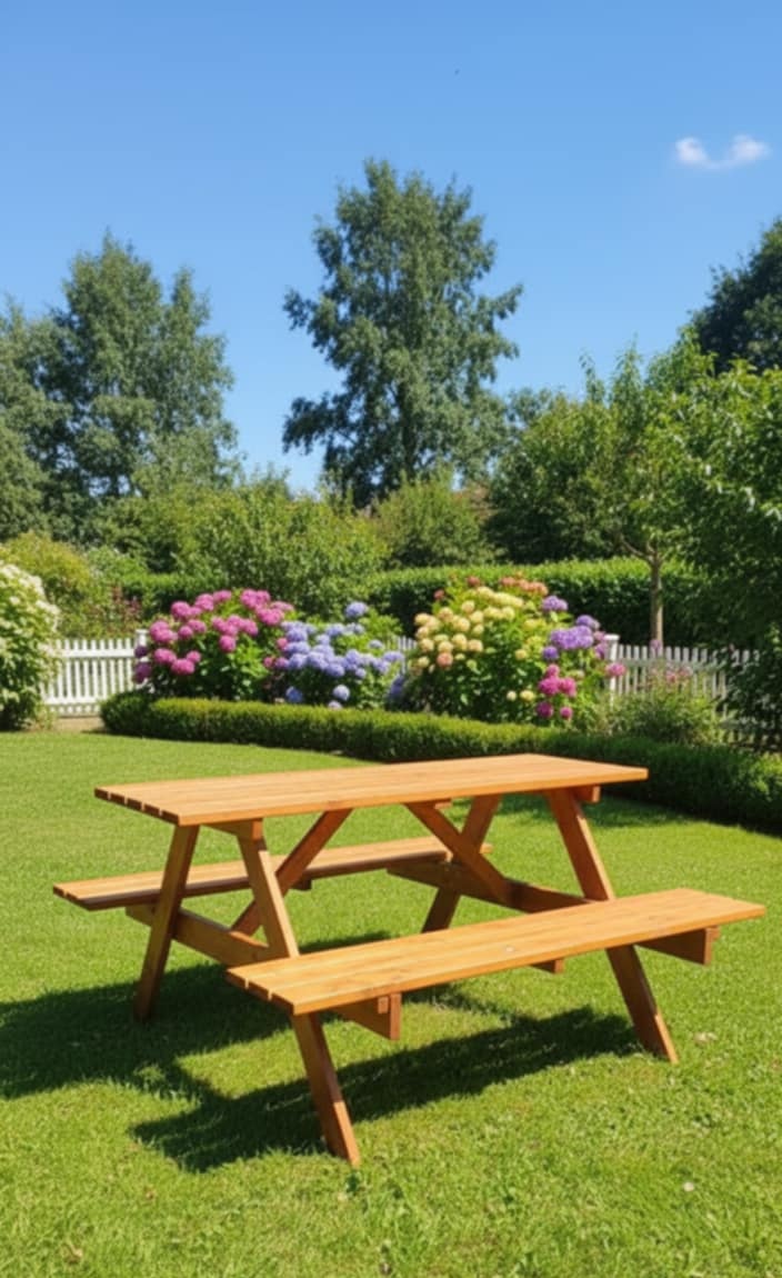 Unser hochwertiger Picknicktisch aus 100 % massivem Naturholz ist die perfekte Sitzgruppe für Garten, Terrasse, Balkon oder Gastronomie.